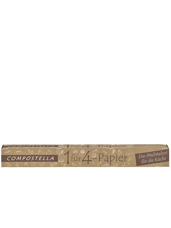 Greased with a little butter or fat, Compostella “1 for 4-Paper” is ideal as a natural alternative to silicone-coated baking paper. Simply tear off the desired length of paper, place it on the baking tray and grease it with butter or other fat to prevent sticking. The paper is heat-resistant up to 220°C, greaseproof, and of course completely compostable.