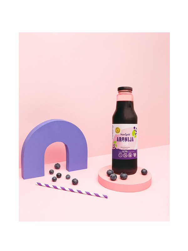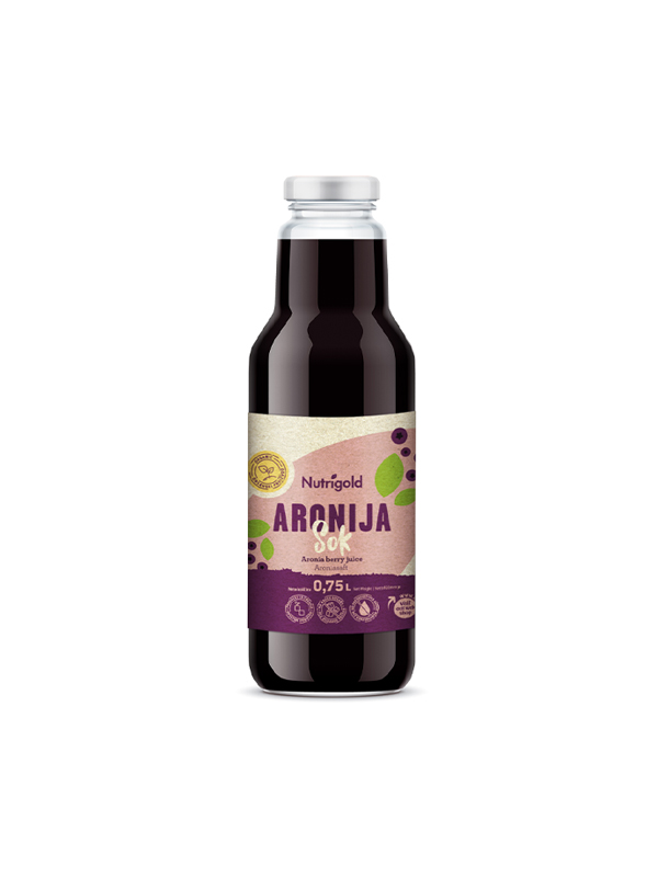 Nutrigold aronia juice is an organic product purely obtained from Croatian aronia berry, without added sugar, water and preservatives, produced under strict production conditions.