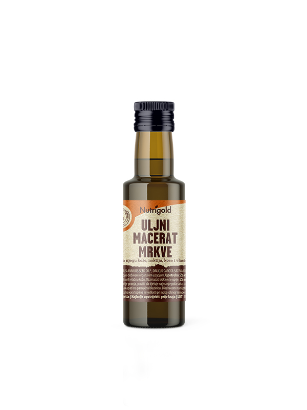 Nutrigold carrot oil macerate is one of the finest nourishing preparations for treating all skin types. Obtained from 100% natural ingredients of organic agriculture: