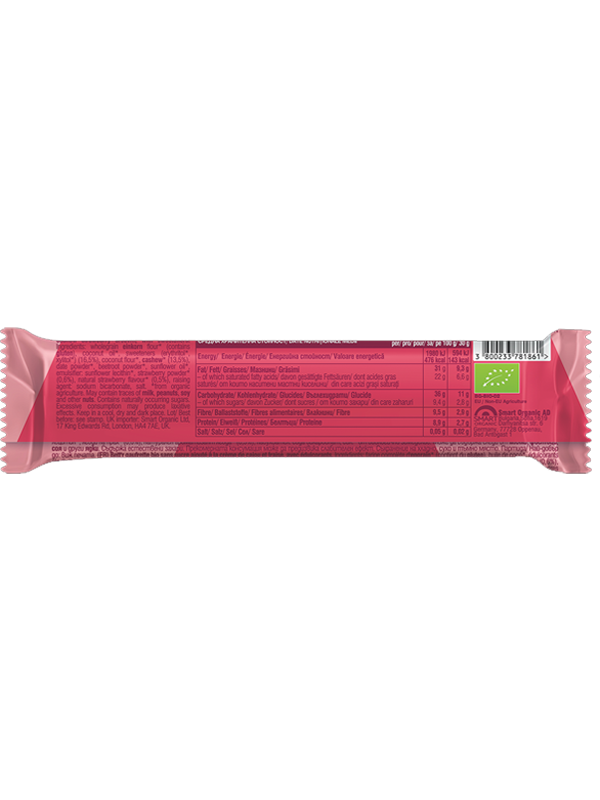 Wholemeal einkorn wheat flour*, date powder*, coconut oil*, cashew nuts* (12%), sweetener: erythritol*, coconut flour*, beetroot powder*, sunflower oil*, emulsifier: sunflower lecithin*, strawberry powder* (0.6%), natural strawberry flavor* (0.5%), raising agent: sodium bicarbonate, salt
