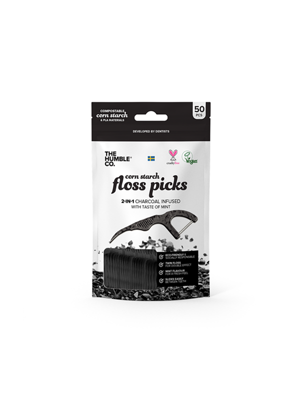 Humble Brush floss picks with charcoal and mint makes flossing a piece of cake! Double threading ensures that food debris is effectively removed whilst the shape of the pick promotes easy access to those hard to reach places. Made from corn-starch and packaged in eco-friendly paper packaging, humble floss picks aim to minimise the stress on our environment whilst providing a first class experience.