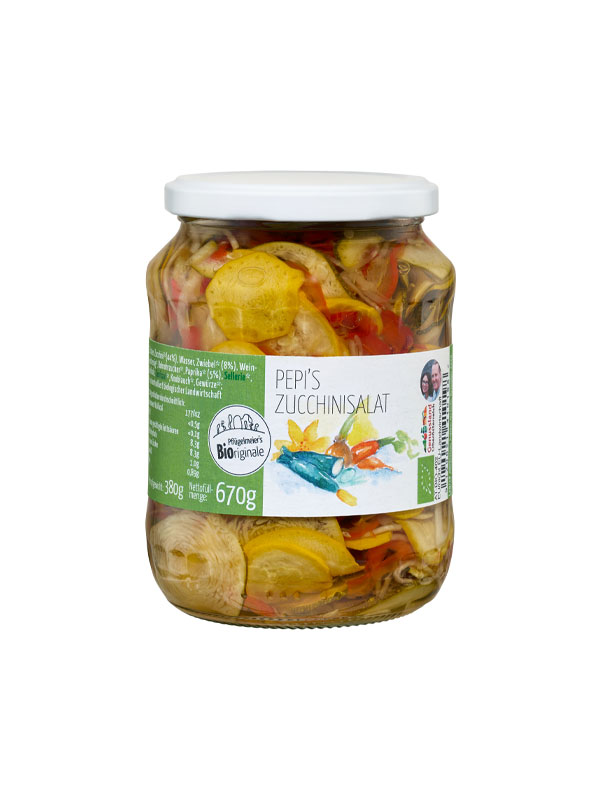 Pflügelmeier's Bioriginale zucchini salad is 100% organic and free from preservatives. Freshly harvested organic zucchini are carefully selected to provide top quality and maximum flavour.