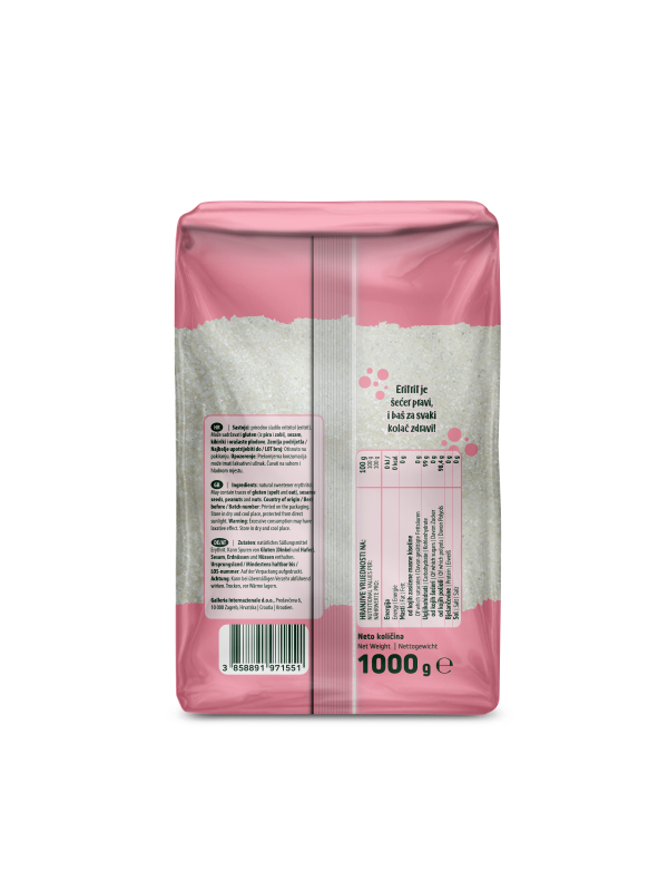 Nutrigold erythritol is a natural sweetener with a cooling, refreshing and sweet flavour that completely replaces traditionally used sugar in preparing low-calorie sweets and desserts making them much healthier. Aside from being an excellent sugar substitute, bear in mind that this natural sweetener can not be used in bread with yeast and can not be caramelised.