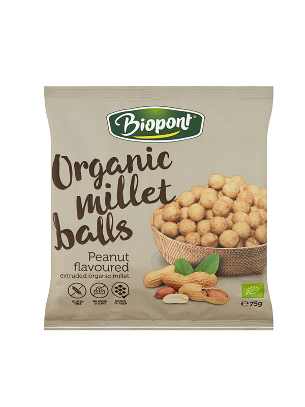 Peanut flavoured extruded millet balls can be consumed as a snack, but they are also suitable as an ingredient in various dishes for added texture and flavour. Gluten free and organic product.