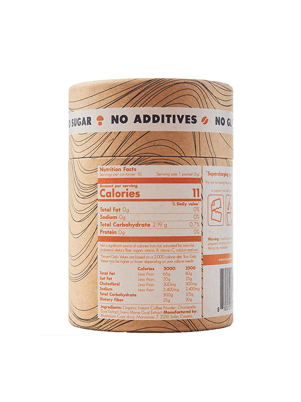 Instant coffee powder*, dual extract of Chanterelle (Cantharellus Cibarius), dual extract of Lion’s Mane (Hericium Erinaceus)
