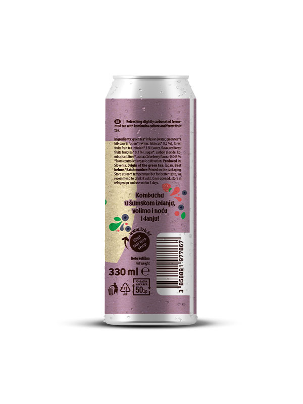 Green tea drink* (water, green tea*), hibiscus drink* (water, hibiscus 0.15%*), forest fruit drink 3%* (water, flavored forest fruit tea 0.15%*), sugar*, carbon dioxide, kombucha culture*, natural blueberry flavour 0.04%