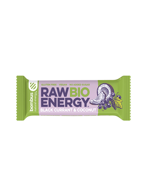 Raw energy bar with organically cultivated black currant and coconut momentarily boosts energy levels while offering delicious fruity flavour.