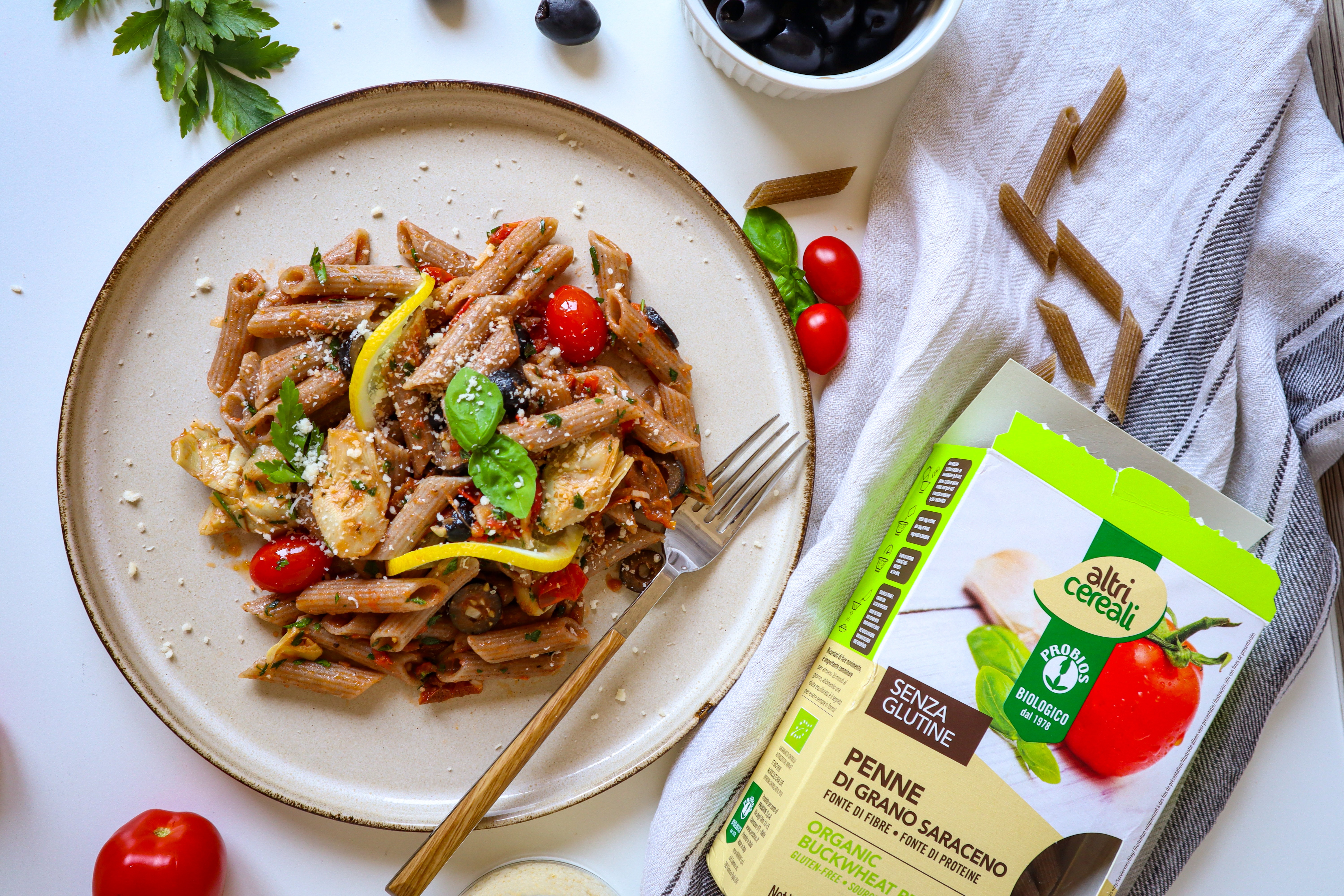 Buckwheat pasta is full of protein! Hopefully, we already got your attention with those few words. Nevertheless, stick around... and fall in love with the Mediterranean colourful pasta with lots of vegetables that will remind you of a vacation all year round.