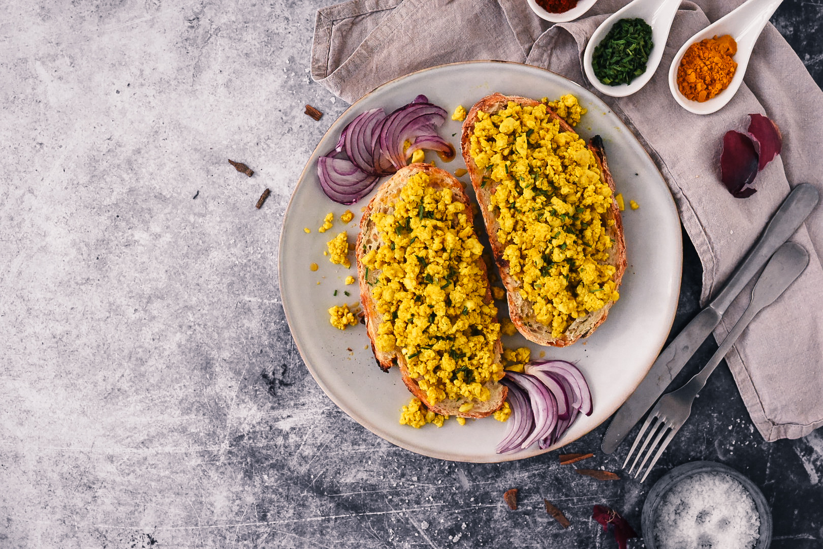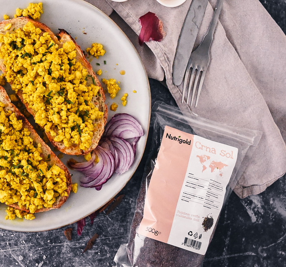 Unlike other protein-rich food (meat and dairy products), tofu is easy to digest due to fibres and water-soluble carbohydrates are being removed in the production process. It contains iron, magnesium, zinc, vitamins B and E. It is also cholesterol-free and possesses a low caloric value. Minced tofu with a little vegetable milk (mostly soy) guarantees you the right texture of scrambled eggs that we are all accustomed to. For a real authentic taste, there is one slightly intense, but very good ingredient called black salt.