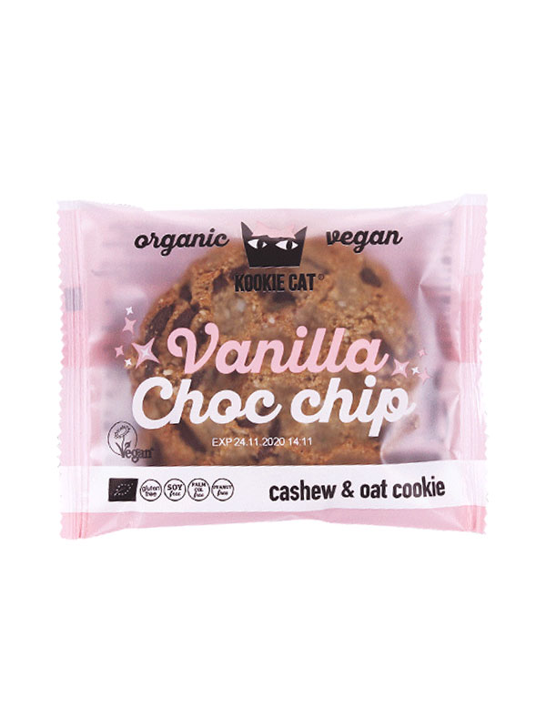 Kookie Cat cookie with an excellent composition will delight you with the first taste! Made from organically grown ingredients, it is adorned with an abundance of nutritional benefits. Oat flakes form the base of the cookie, while pieces of cashews, irresistible chocolate chips and coconut create a wonderful mouthful experience.