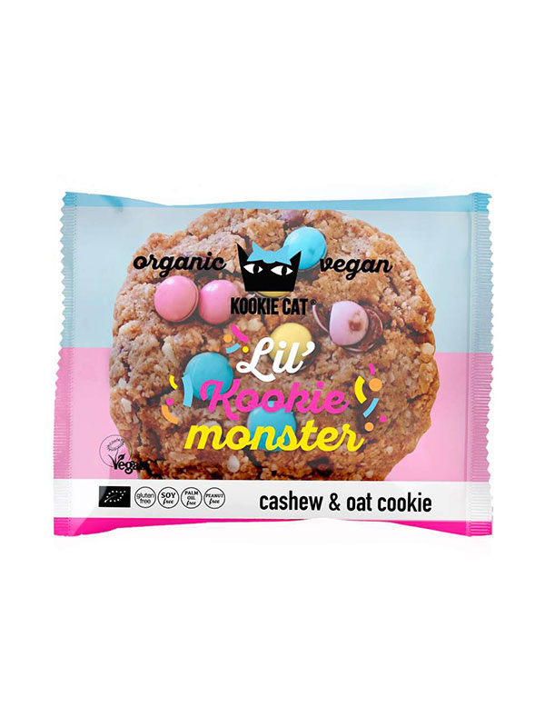 Organic crunchy Kookie Cat Lil' Monster cookie with a great composition will delight you with the first bite! Oat flakes form the base of this cookie, and an additional taste experience is achieved by adding pieces of cashew nuts, irresistible chocolate, colourful chocolate buttons and coconut chips.